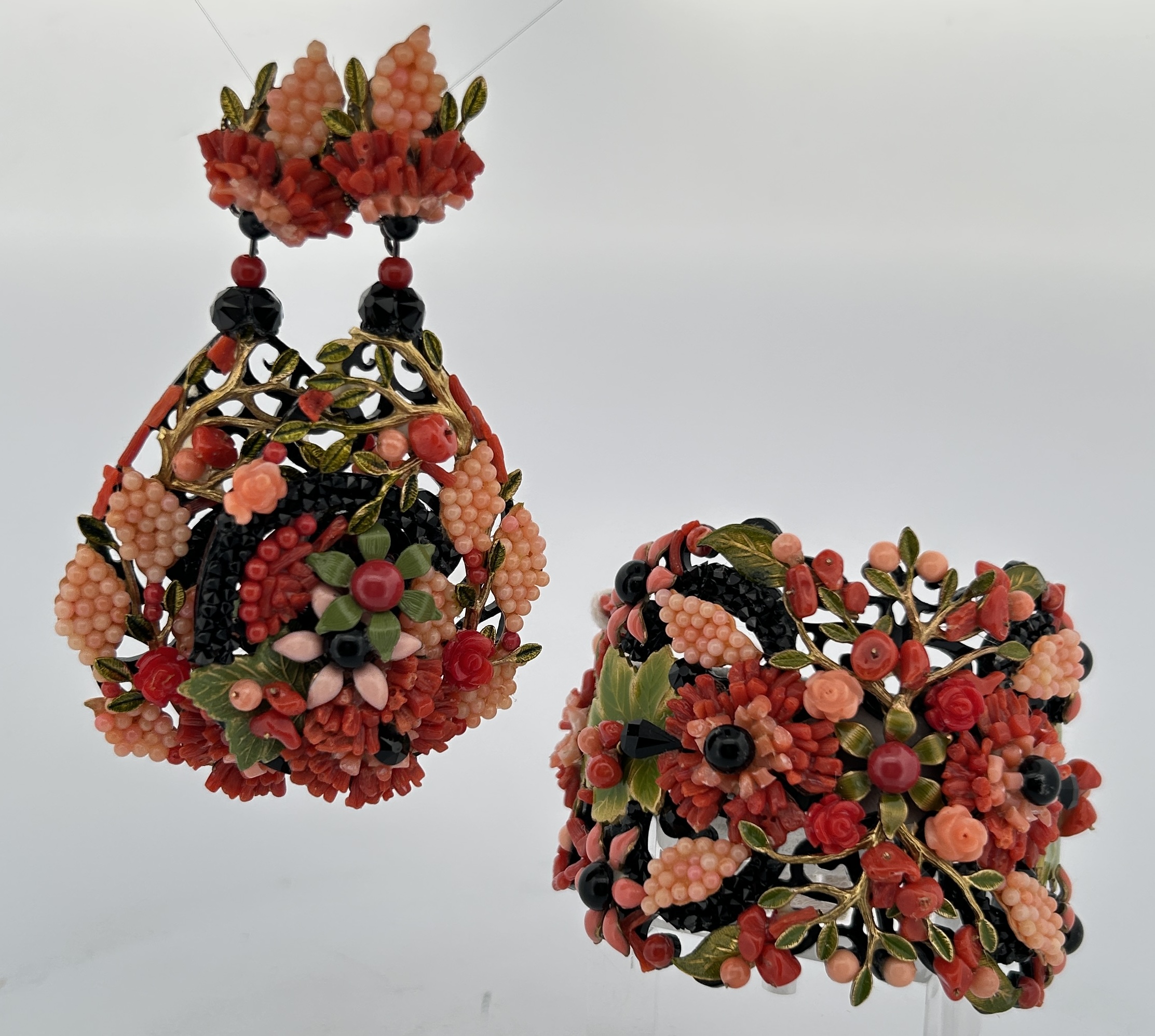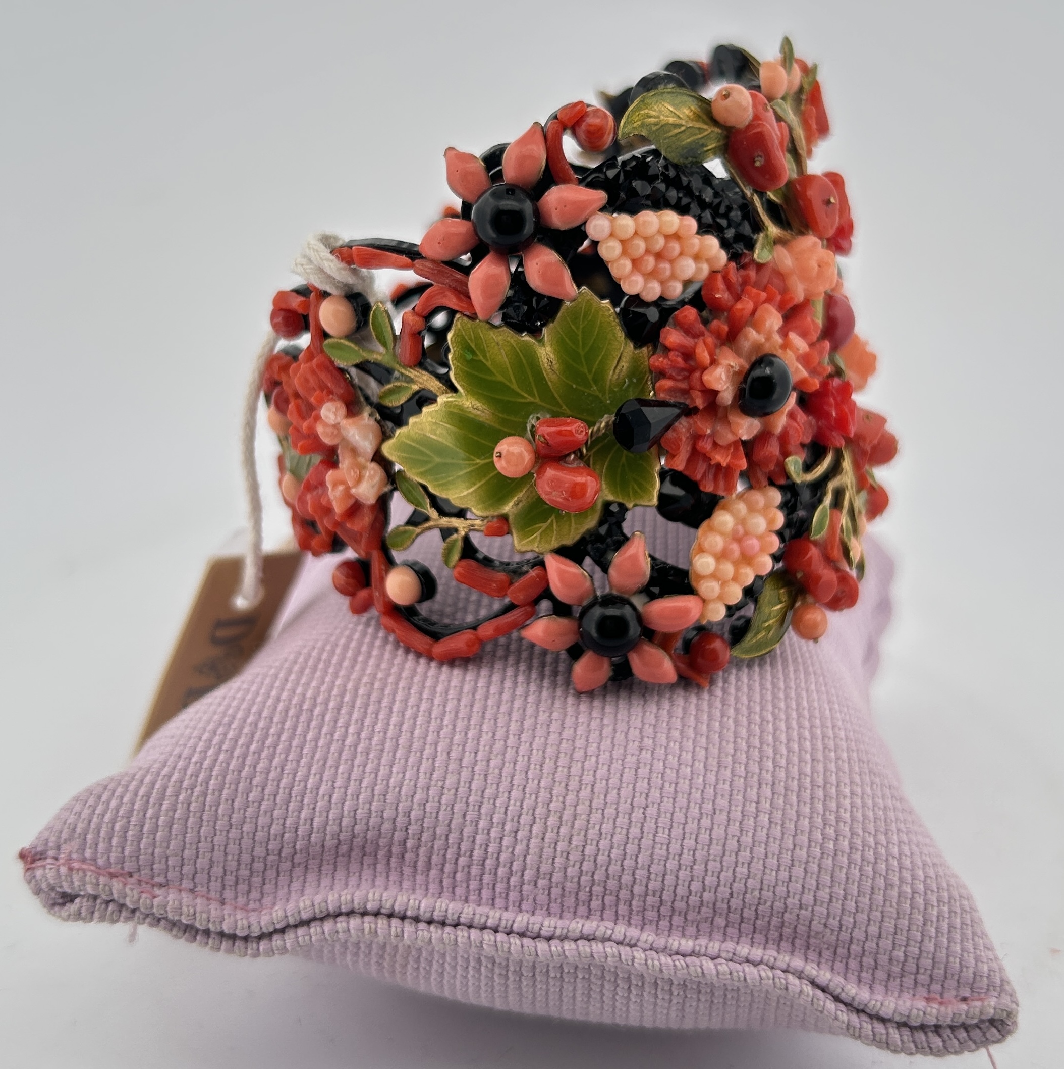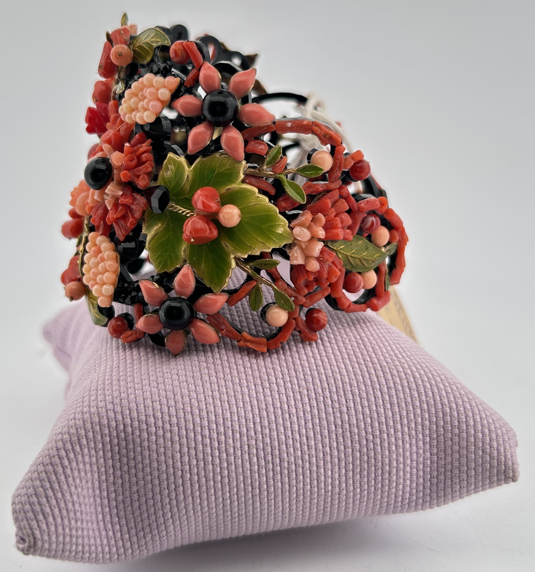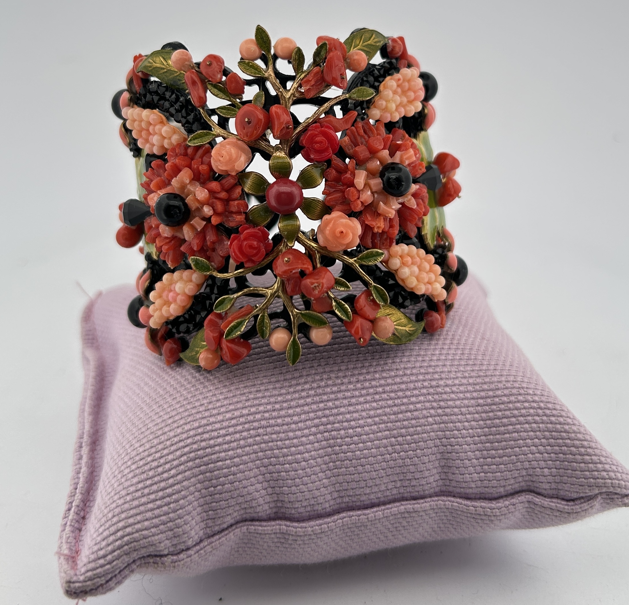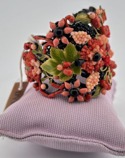 Bracciale siciliano con struttura in osso e con pezzi di corallo e smalti.