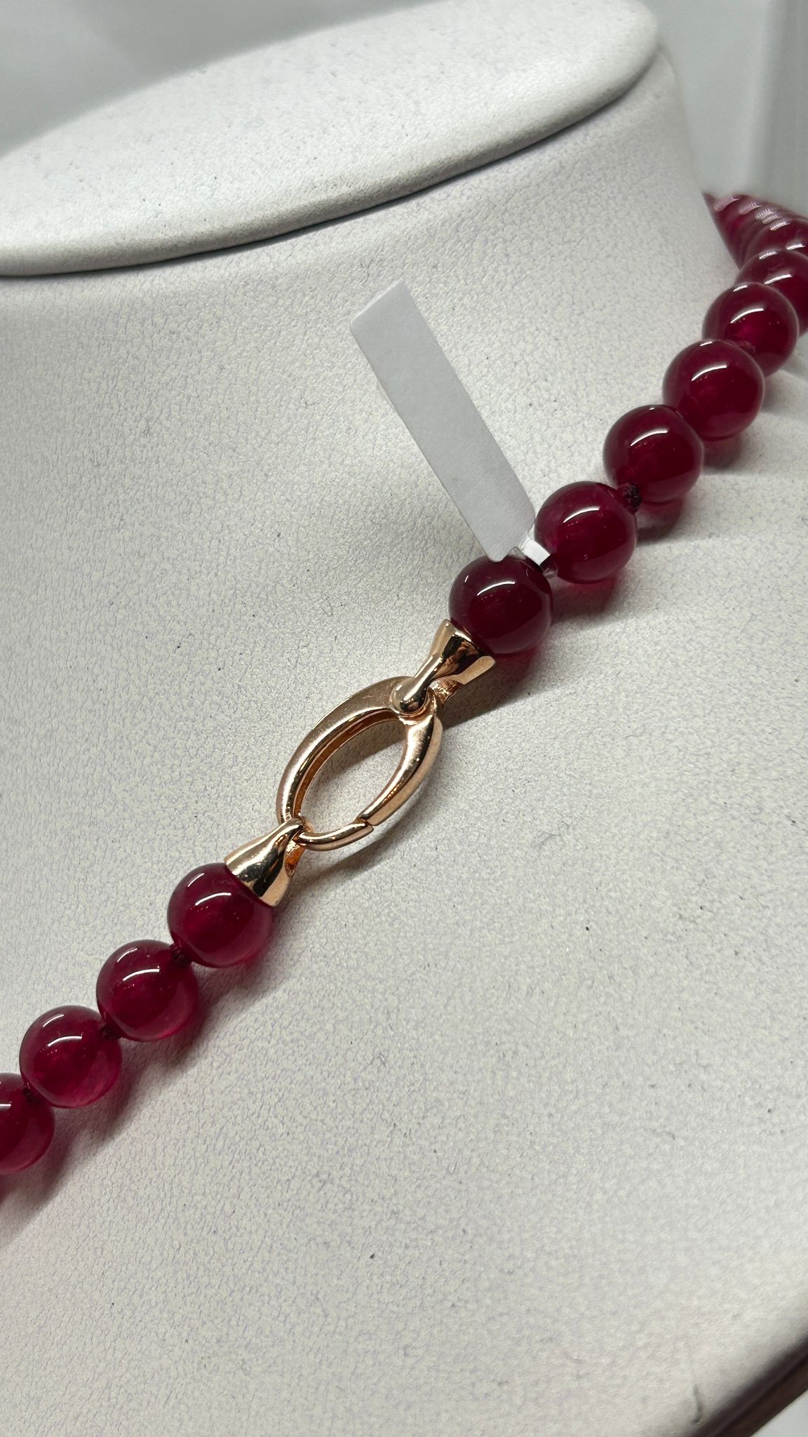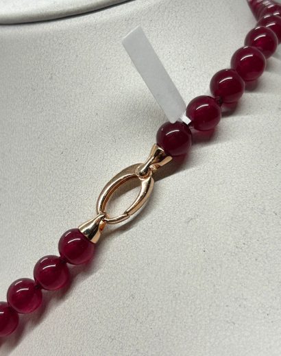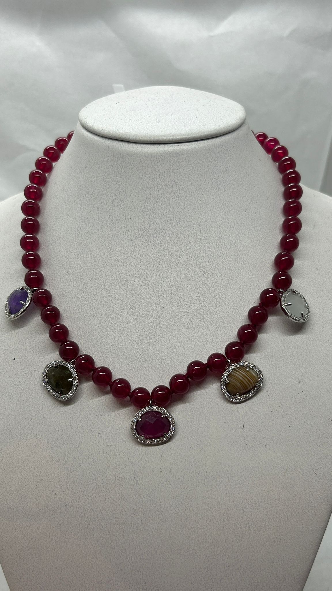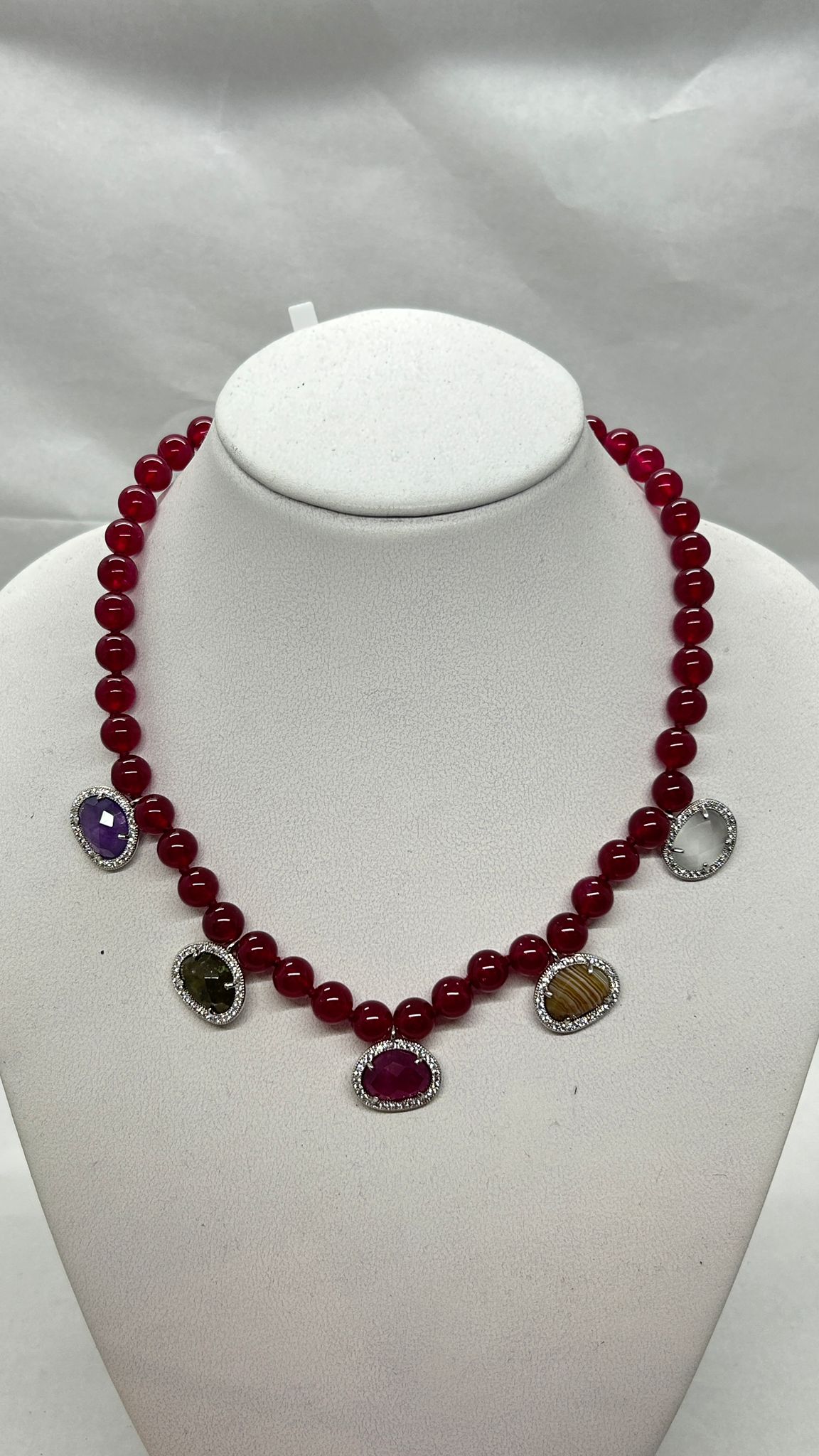 • Collana con pietre dure, agata rubino, elementi a goccia con zirconi e chiusura in argento.
