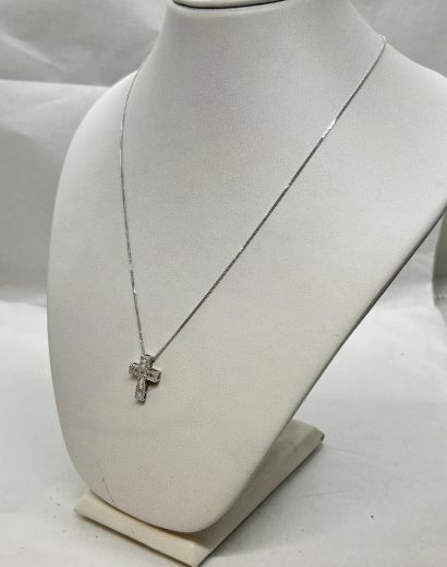 • Collana in oro bianco 18 kt con croce taglio baguette brillanti centrali.