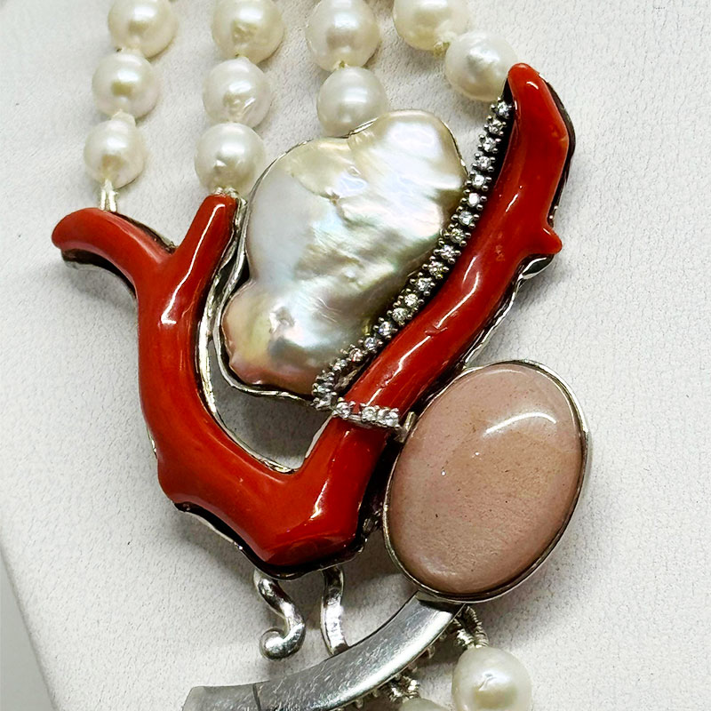 - Girocollo a 4 fili di perle con elemento in corallo naturale con perla scaramazze, quarzo e zirconi con montatura in argento.