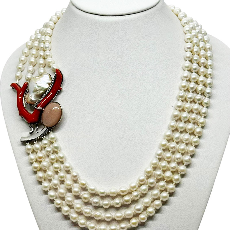 Girocollo a 4 fili di perle con elemento in corallo naturale con perla scaramazze e quarzo