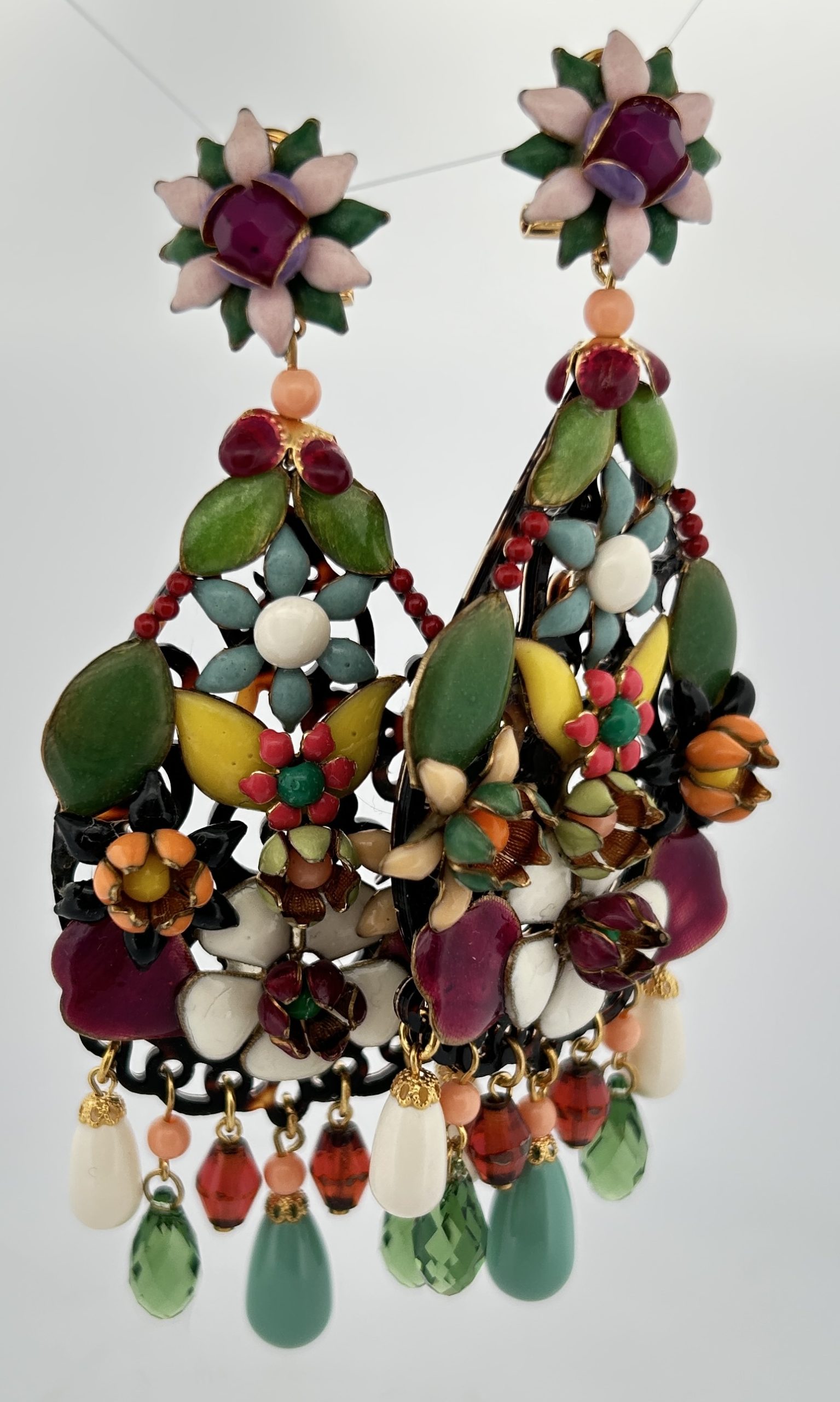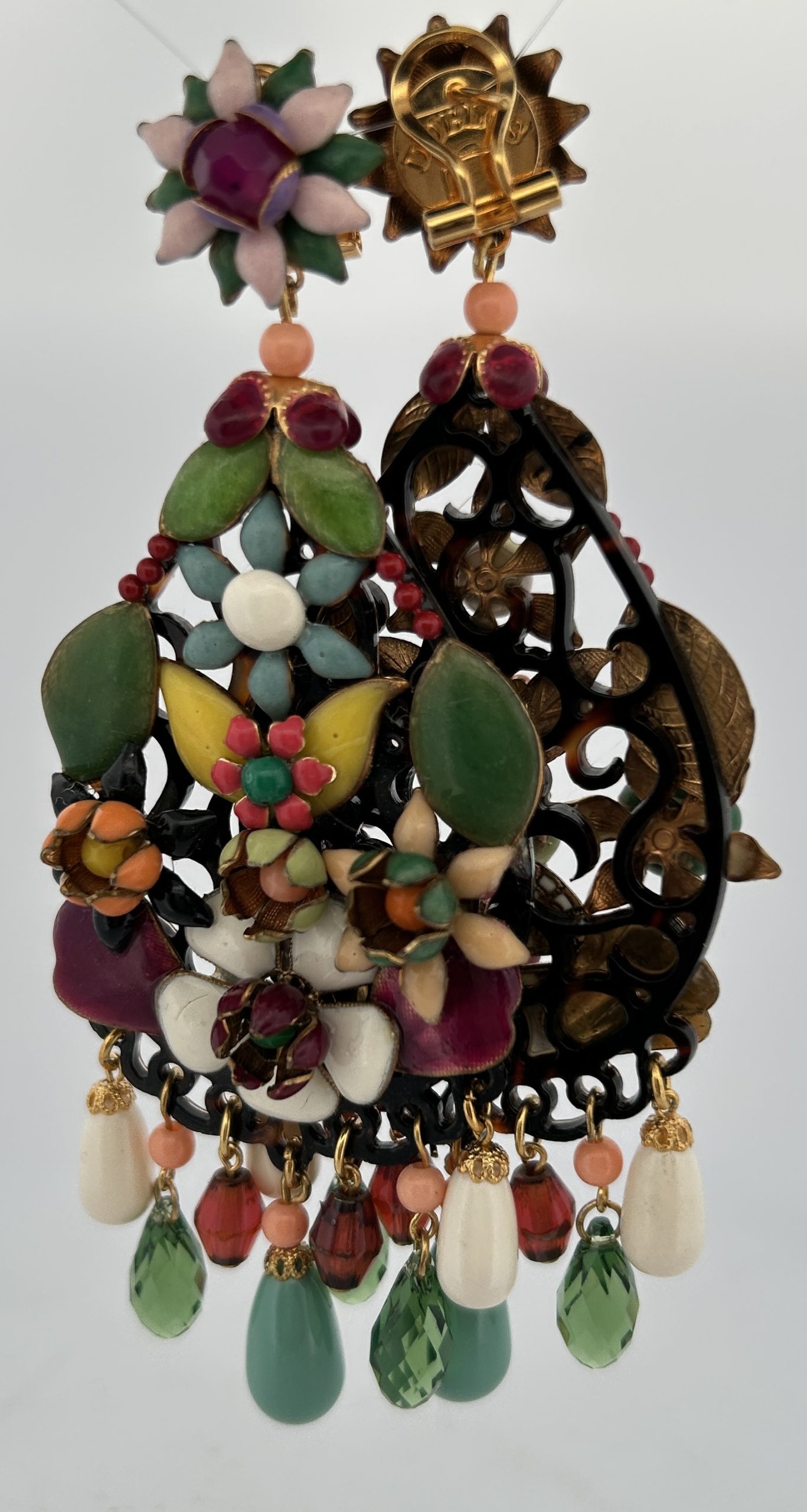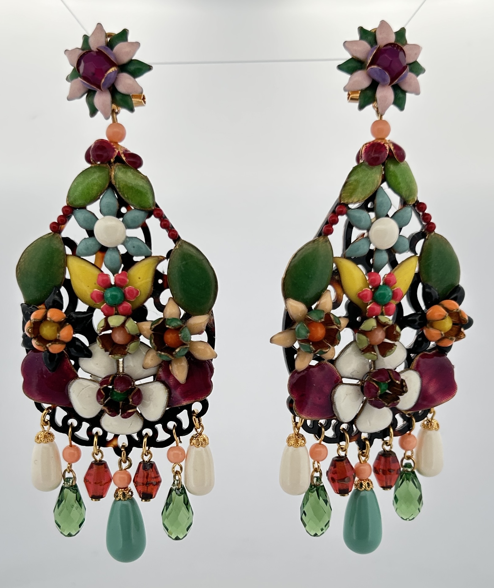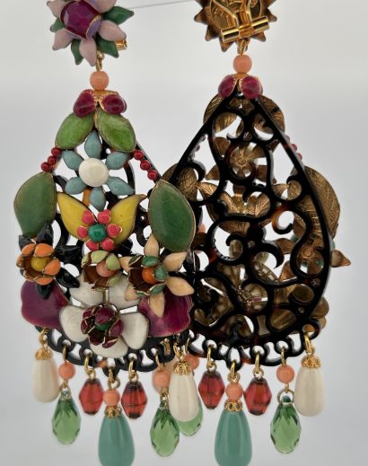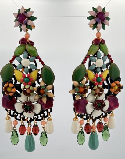 Orecchini pendenti con base in osso con fiori in rilievo smaltati e in rilievo.