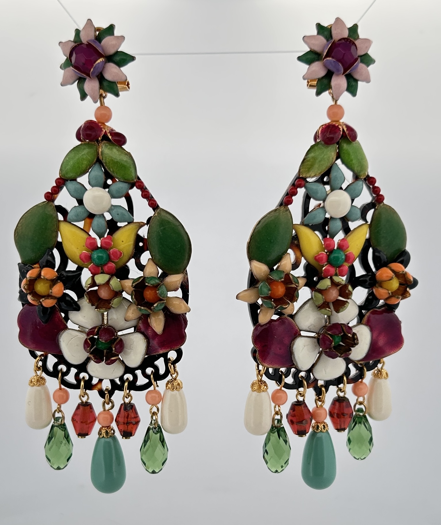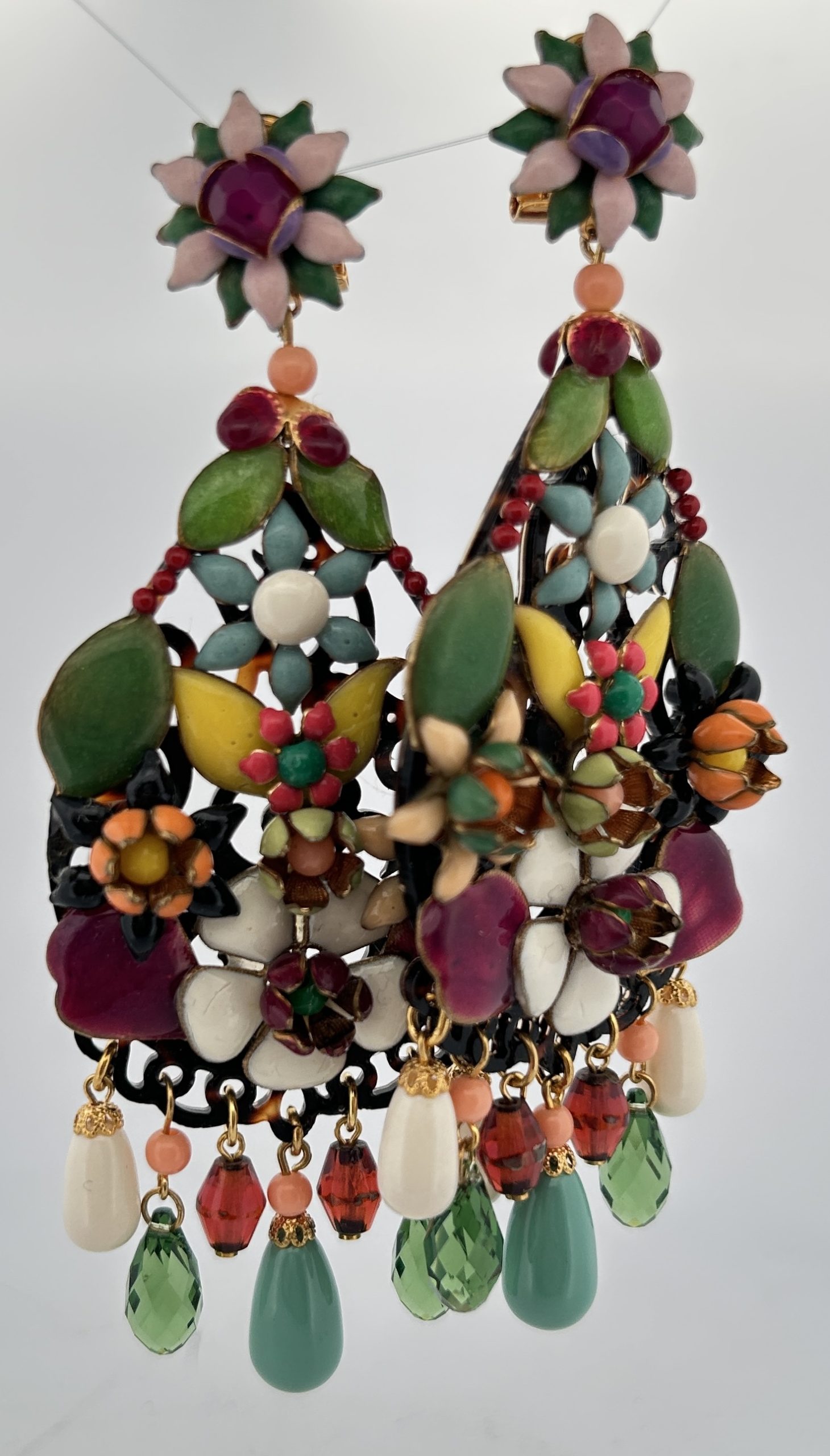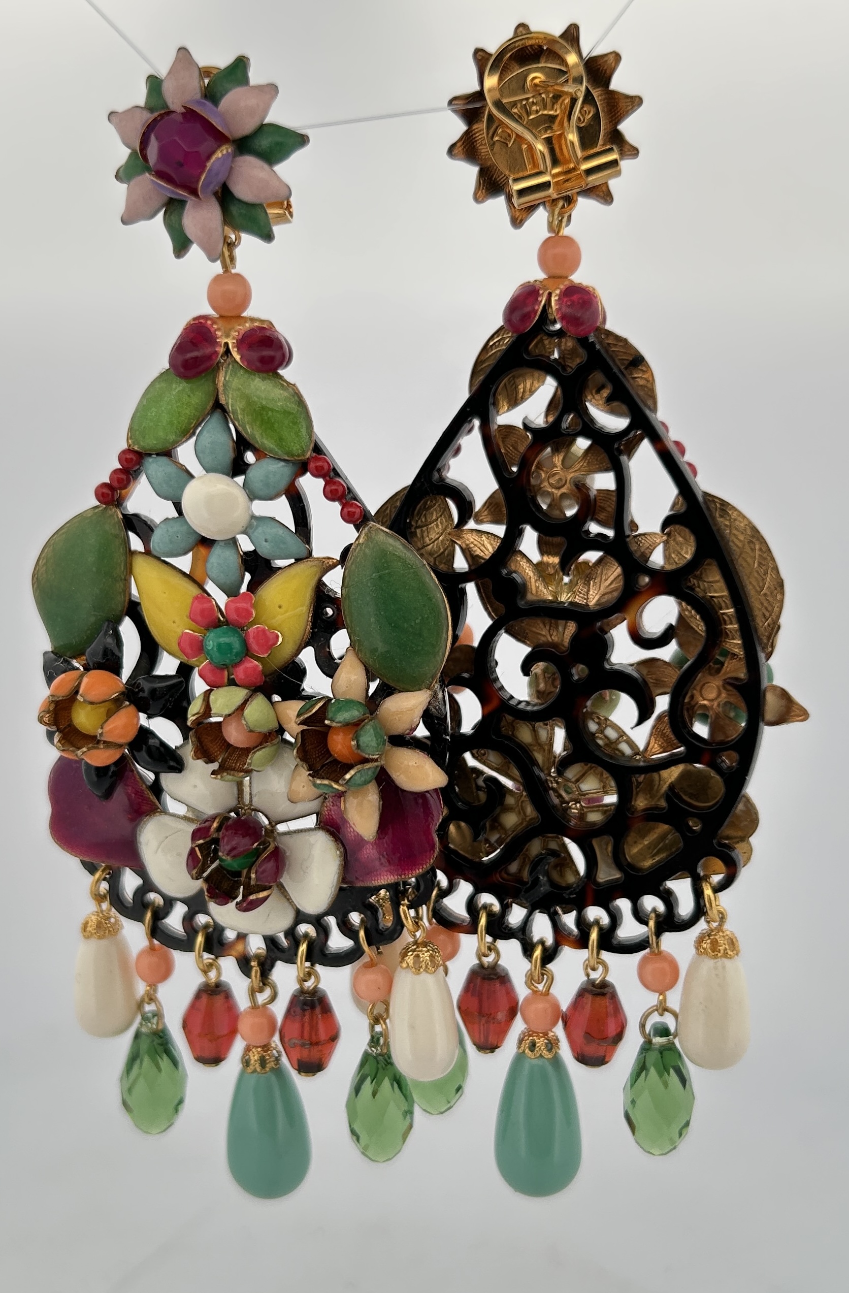 Orecchini pendenti con base in osso con fiori in rilievo smaltati e in rilievo.