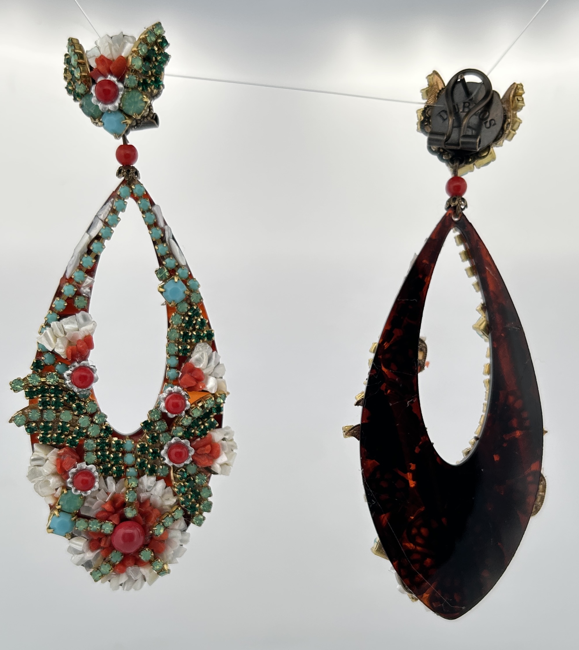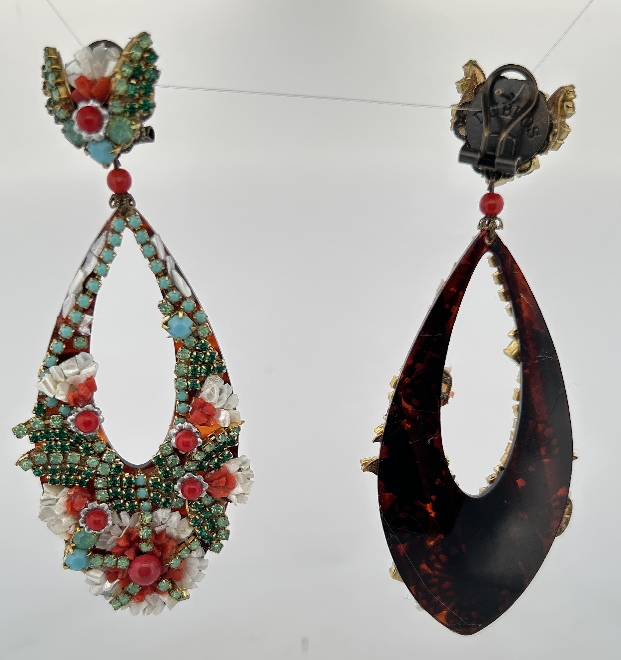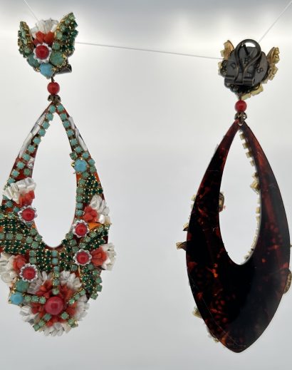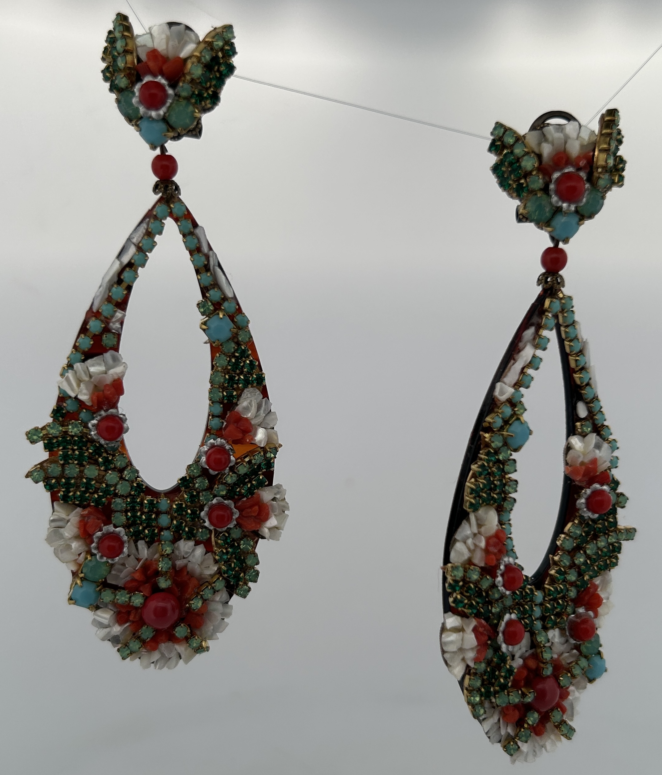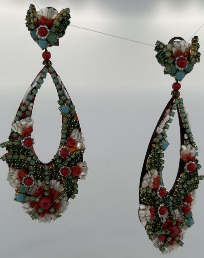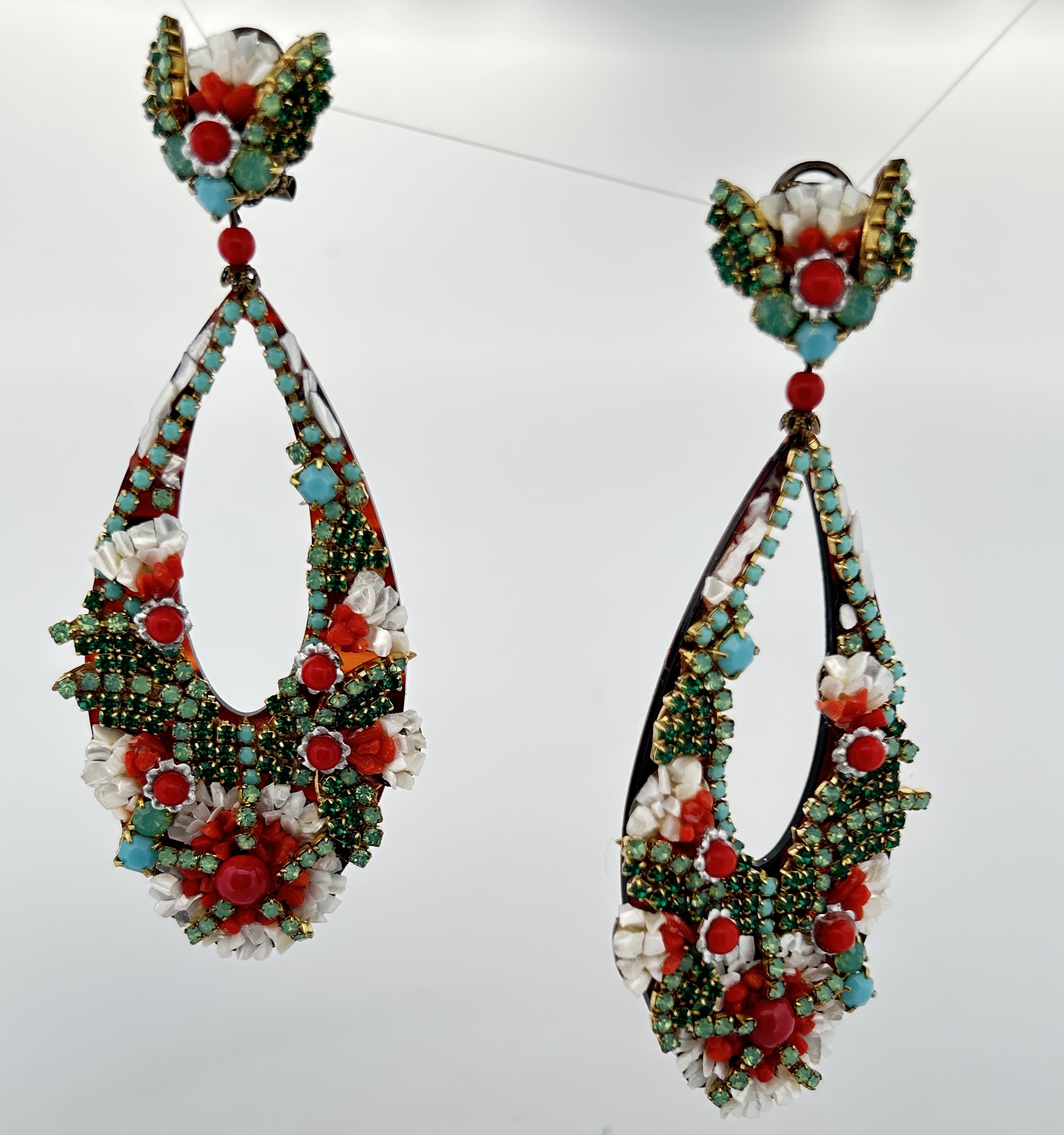 Orecchini pendenti con inserti in madreperla e corallo, impreziositi da strass color varde, alabastro e turchese.