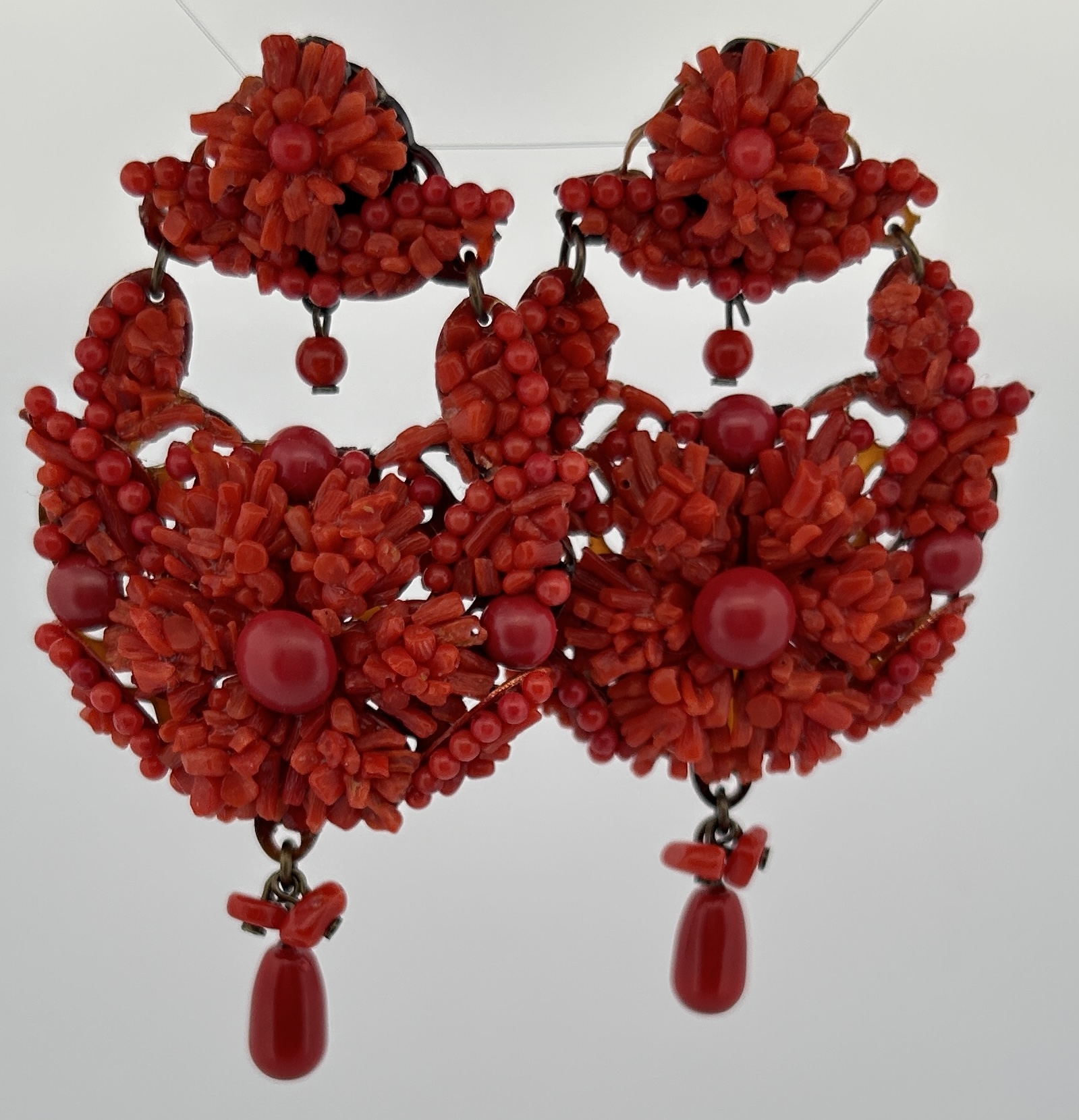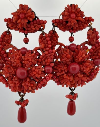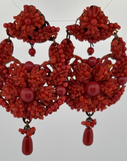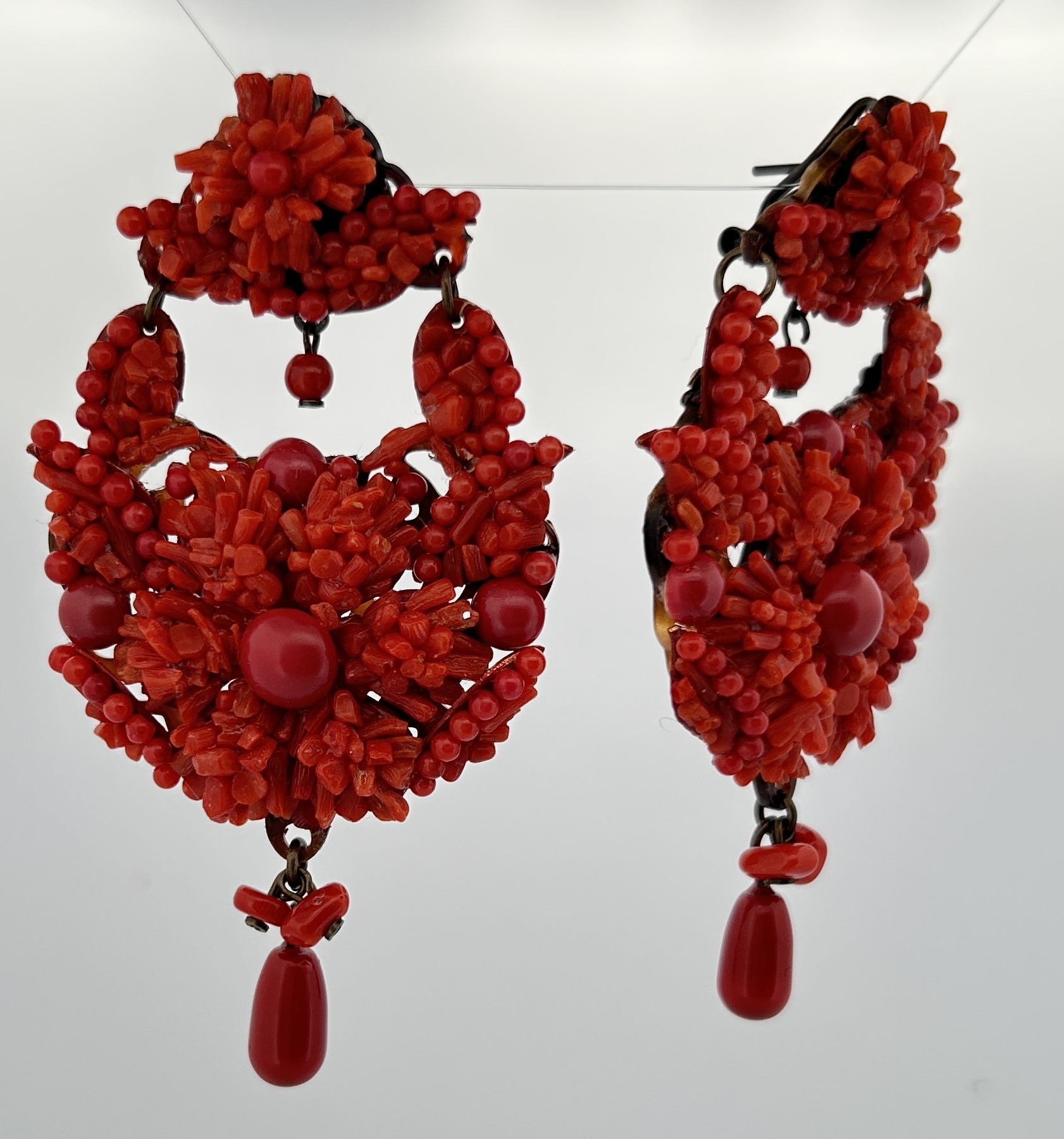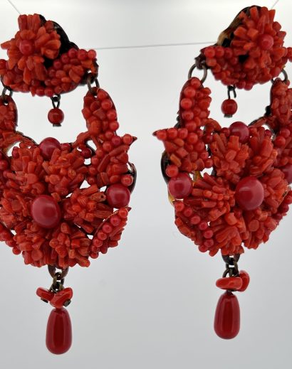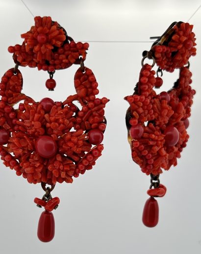 Orecchini pendenti con struttura in osso con pezzi di corallo.