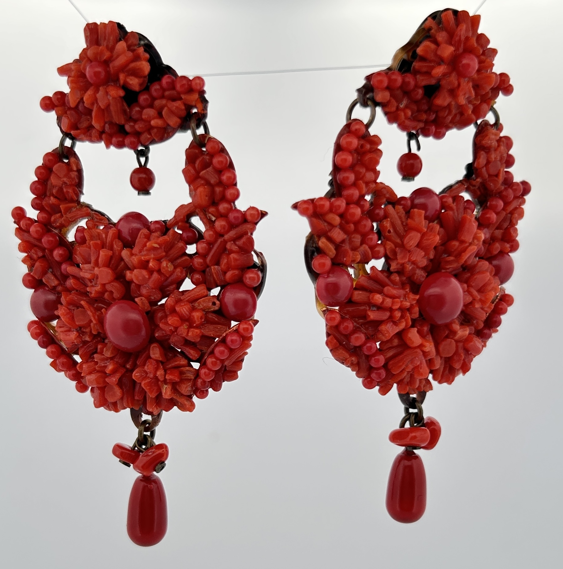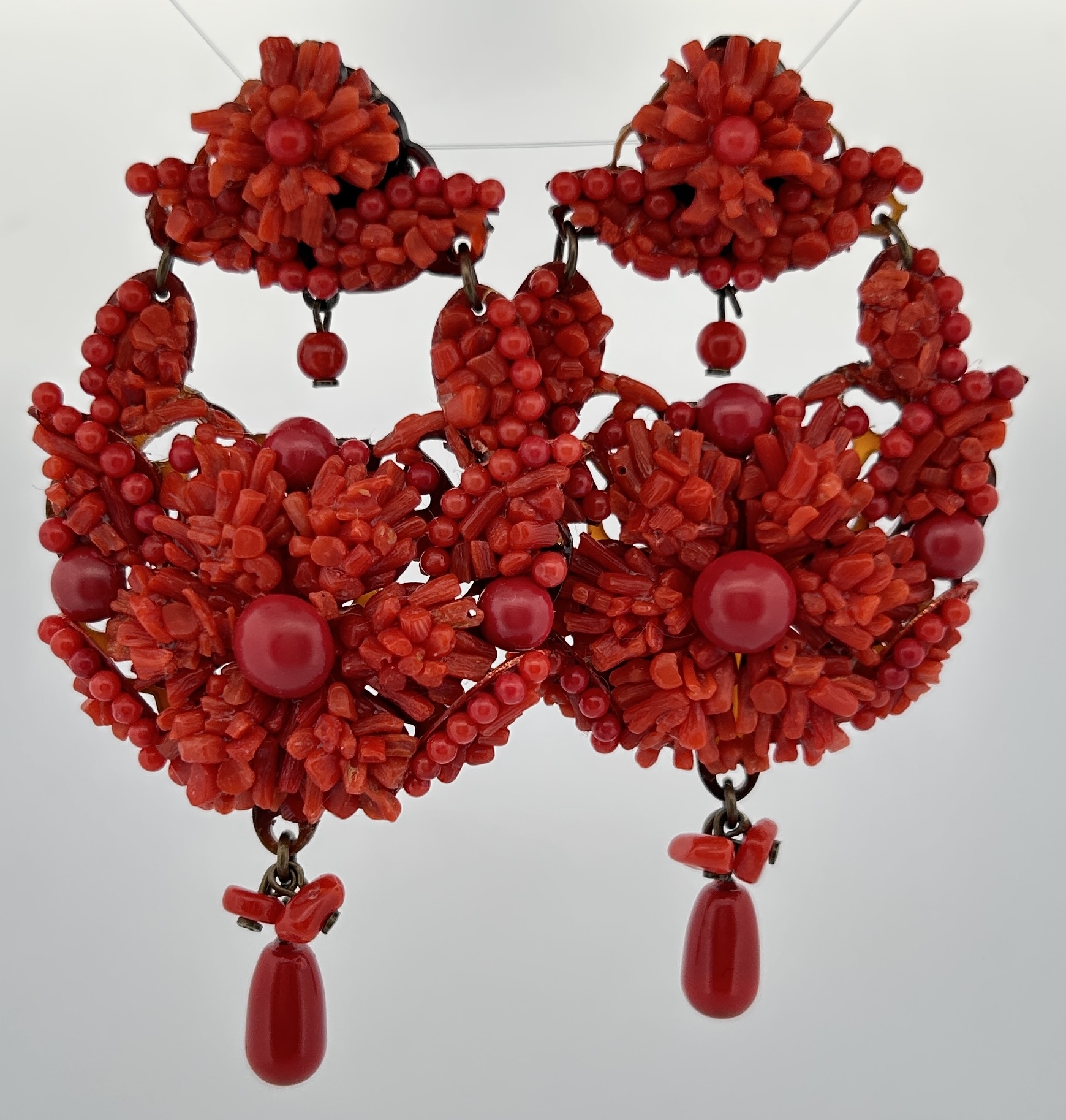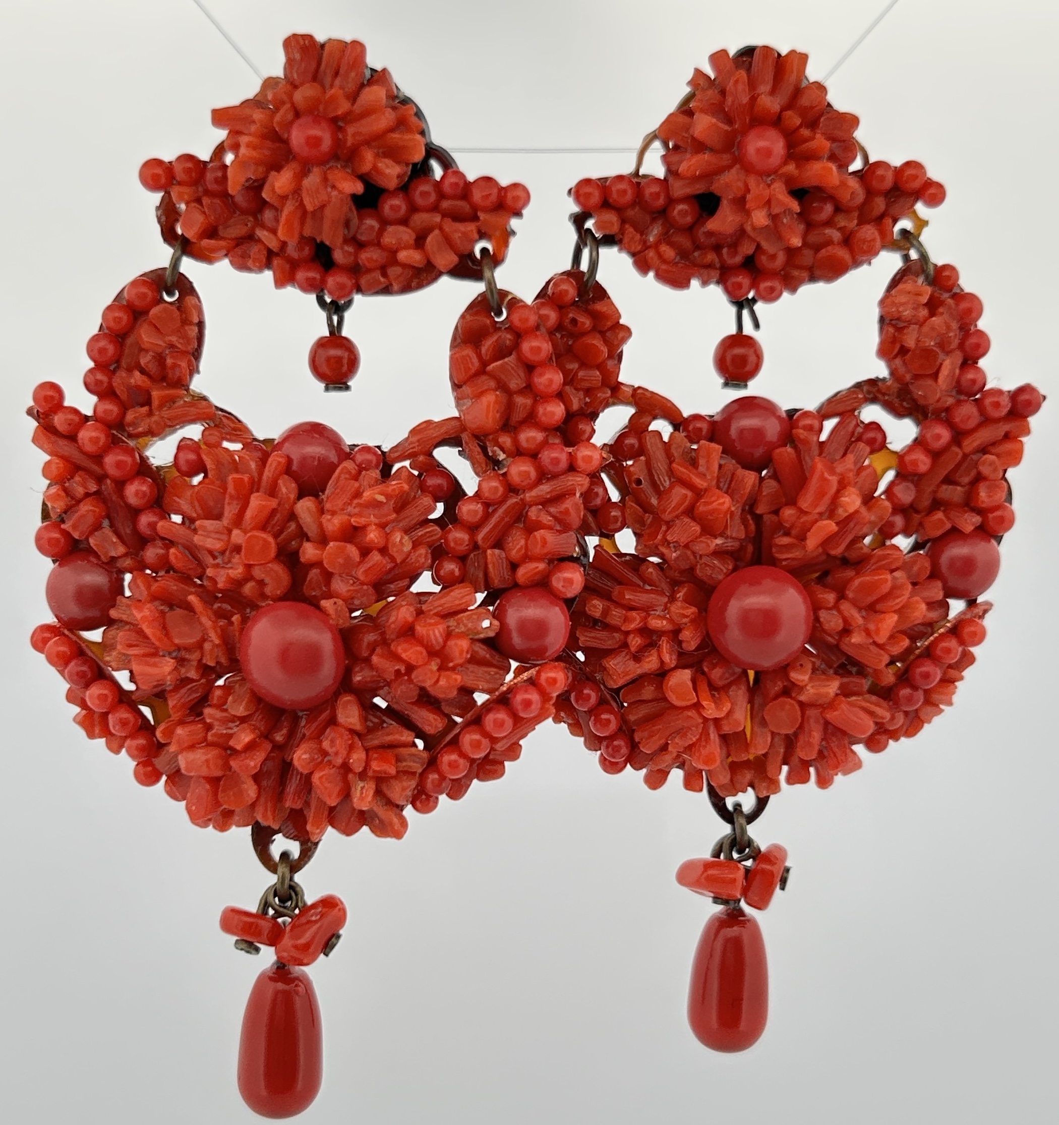 Orecchini pendenti con struttura in osso con pezzi di corallo.