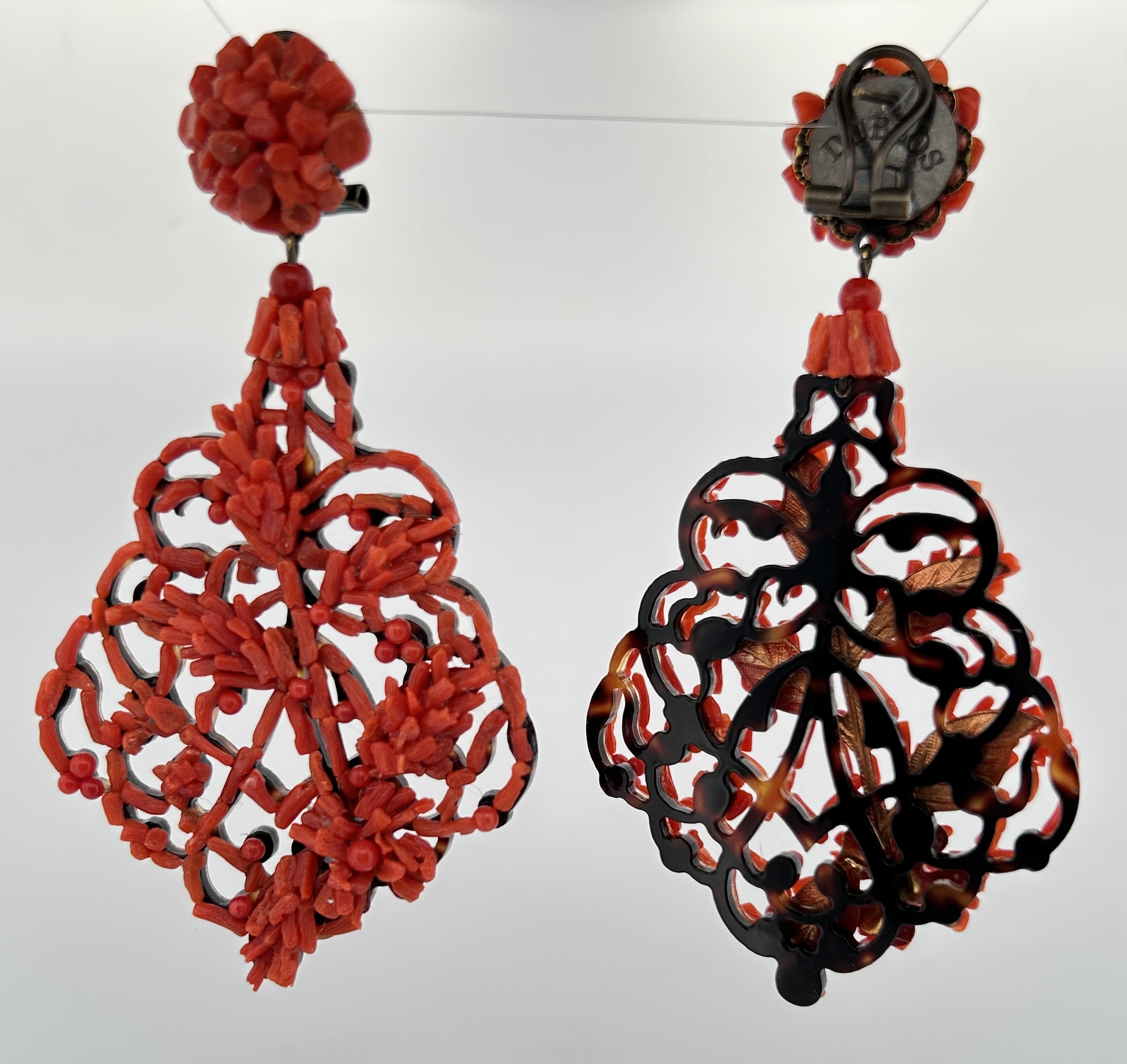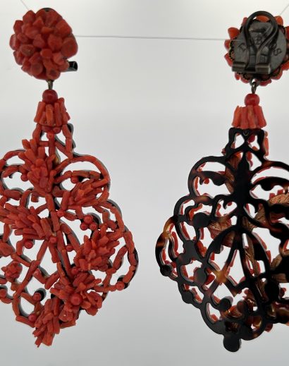 Orecchini pendenti con struttura in osso con pezzi di corallo.