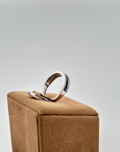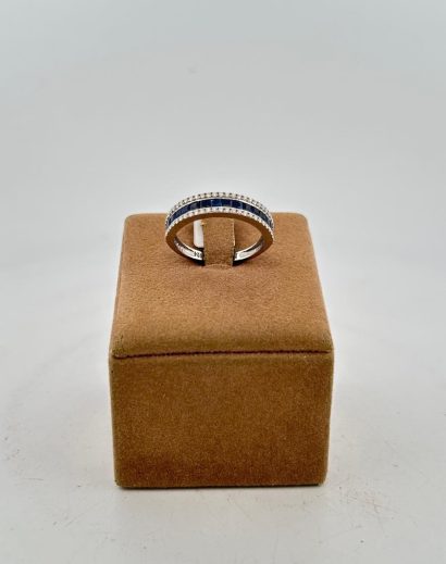 Anello in oro bianco 18 kt con taglio baguette di zaffiri centrali e brillanti